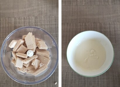– Die Waffeln fein hacken und die weiße Schokolade schmelzen.