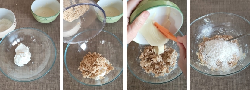 – Den Ricotta in eine Schüssel geben, dann das Waffelmehl und die abgekühlte Schokolade hinzufügen; mischen und auch das Kokosnussmehl hinzufügen.