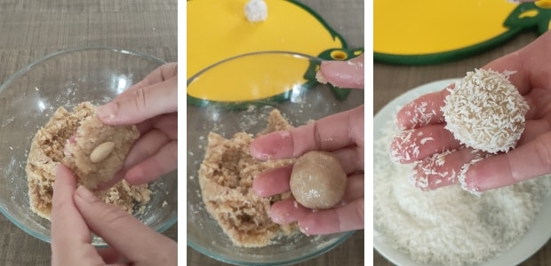 – Eine kleine Menge Teig nehmen, leicht flachdrücken und in die Mitte eine Mandel legen. Zu einer Kugel formen und dann in geriebener Kokosnuss rollen.
