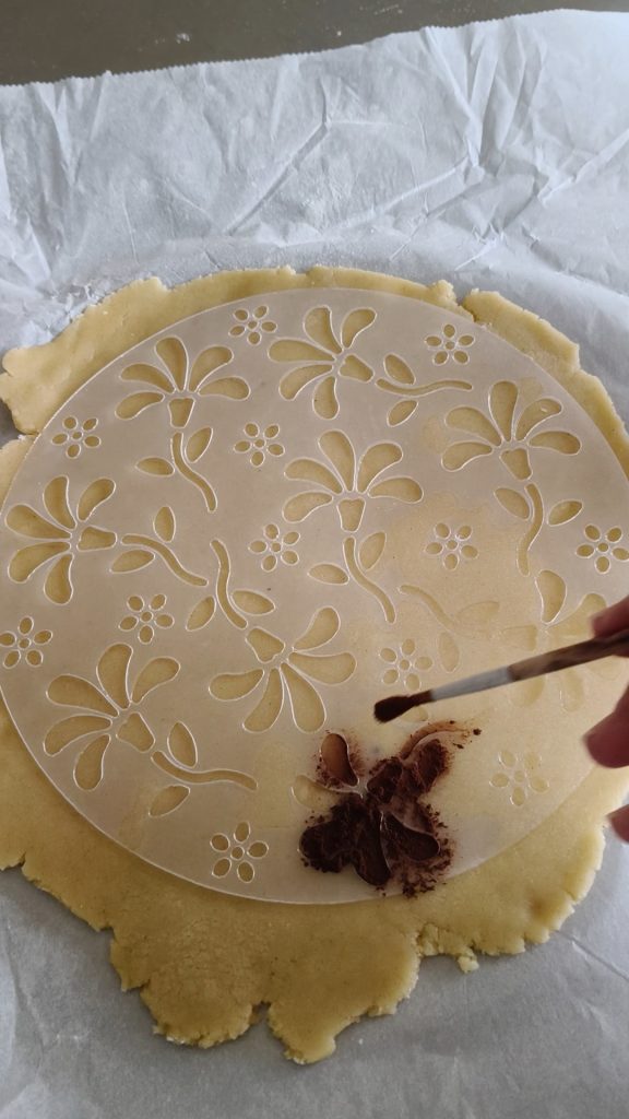 Den restlichen Teig ausrollen, vorübergehend auf ein mit Backpapier ausgelegtes Blech legen (um ihn in den Kühlschrank zu stellen), das gewählte Stencil darauflegen und die Aussparungen mit Kakao füllen. Für diesen Vorgang ist es ratsam, einen Pinsel zu verwenden, der hilft, überschüssigen Kakao zu entfernen. Wenn die zu „zeichnende“ Fläche größer ist, weil Sie einen größeren Kuchen haben, das Stencil vorsichtig heben, um das Muster nicht zu verschmutzen.
