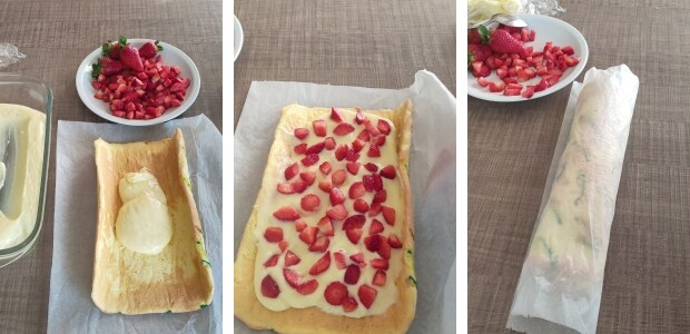– Den Biskuitteig vorsichtig aufrollen und mit Konditorcreme und vorher gewaschenen, getrockneten und in Stücke geschnittenen Erdbeeren füllen. Von der langen Seite her aufrollen und für mindestens 2 Stunden in den Kühlschrank stellen.