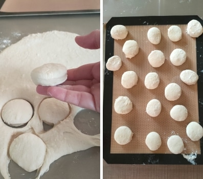 Den Teig vorsichtig mit dem Nudelholz auf eine Dicke von einem Zentimeter ausrollen und Scheiben mit einem Durchmesser von 2 cm ausstechen (meine sind 5 cm).