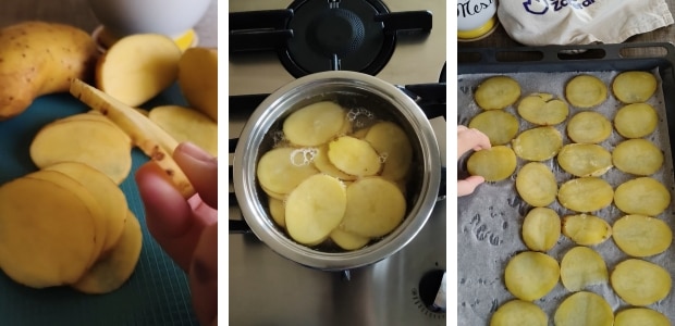 – Die Kartoffeln nicht zu dünn schneiden und dann etwa 5/7 Minuten in leicht gesalzenem Wasser kochen. Sie sind fertig, wenn eine Scheibe mit einem Zahnstocher eingestochen werden kann, ohne Widerstand zu leisten. Abtropfen lassen, abtupfen und auf ein mit Backpapier ausgelegtes Blech legen. (Das Blech ist befeuchtet, damit das Papier haftet und sich nicht verschiebt).