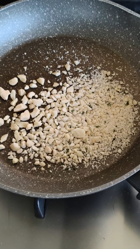 Die Mandeln grob mit dem Rosmarin hacken und trocken in einer heißen Pfanne rösten. Im ausgeschalteten Zustand salzen.