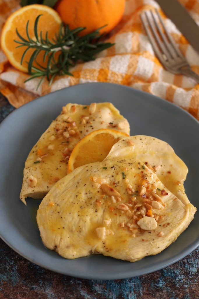 Wenn Sie das Gericht für Weihnachten zubereiten, können Sie das Hähnchen in Fächerform anrichten und mit dünnen Scheiben frischer Orange und Rosmarin dekorieren.