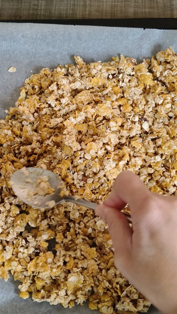 Ausbreiten des Granolas auf einem gelochten Backpapier (oder in einer niedrigen Form, die für die Luftfritteuse geeignet ist) in einer dünnen Schicht — nicht zu kompakt, sonst bleibt die Feuchtigkeit eingeschlossen und trocknet nicht gut.