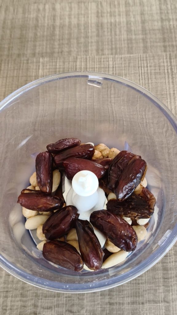 • Fügen Sie die Datteln hinzu und zerkleinern Sie sie (wenn Ihre Datteln zu trocken sind, lassen Sie sie 10 Minuten in warmem Wasser einweichen, dann abgießen und fortfahren).