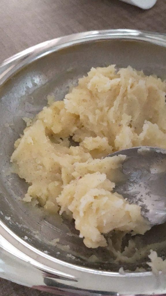 Emulsion nach dem Kühlschrankaufenthalt. Anfangs etwas fest, wird sie durch Rühren mit einem Schneebesen oder einer Gabel leicht erwärmt und erhält die Konsistenz einer dicken Vanillecreme.