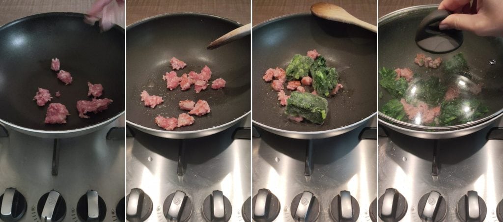 – Die Pfanne auf dem Herd erhitzen, dann die Wurst ohne Haut zerbröseln; ohne Zugabe von Fett anbraten lassen und dann die gefrorenen Spinatwürfel hinzugeben. Abdecken und einige Minuten mit Deckel kochen.