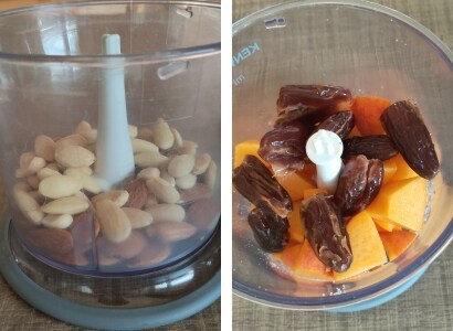 – Geben Sie die Mandeln in den Zerkleinerer und mahlen Sie sie nicht zu fein. Verschieben Sie die Mandeln in die Schüssel und zerkleinern Sie im gleichen Zerkleinerer die in Stücke geschnittenen Pfirsiche samt Haut und die Datteln.