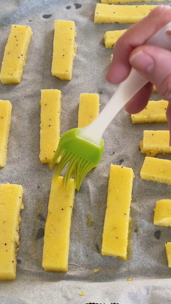 Nehmen Sie die kalte Polenta und schneiden Sie zuerst Streifen und dann die Sticks.