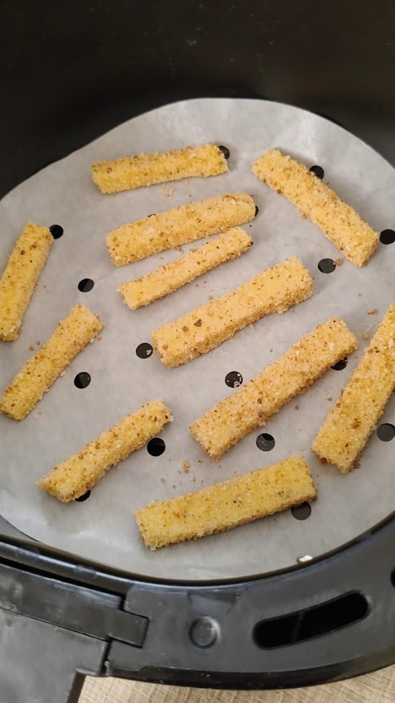 Wenn Sie sich entscheiden, die Polentasticks in der Heißluftfritteuse zu backen, backen Sie sie für 10 Minuten bei 180°C. (Die Polentasticks, die in der Heißluftfritteuse gebacken werden, wurden nicht mit Öl bestrichen, sondern einfach in den Semmelbröseln gerollt, um spezifischen Anforderungen gerecht zu werden).