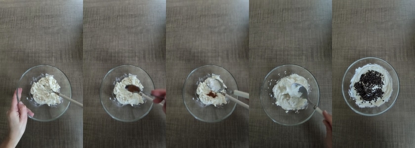 – Drücken Sie den Ricotta mit einer Gabel, fügen Sie den Puderzucker und den Zimt hinzu und mischen Sie mit dem Handmixer, um Klumpen zu entfernen. Schlagen Sie die Sahne separat und fügen Sie sie dann vorsichtig zum Ricotta hinzu. Fügen Sie schließlich die Schokoladendrops hinzu und stellen Sie die Schüssel in den Kühlschrank.
