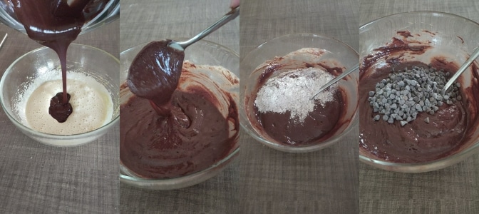 – Die geschmolzene und abgekühlte Schokolade auf die aufgeschlagene Masse gießen, mischen und dann die Pulver und schließlich die Schokoladentropfen hinzufügen. Alles gut vermischen.