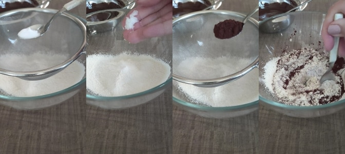 – Mehl in eine Schüssel geben, ein feines Sieb auf die Schüssel legen und Natron, die Prise Salz und den ungesüßten Kakao zum Sieben hinzufügen. Die Pulver vermischen und vorübergehend beiseite stellen.