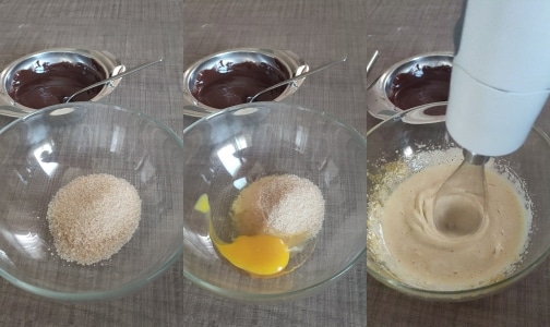 – In einer anderen Schüssel braunen Zucker mit dem Ei mit dem elektrischen Schneebesen oder von Hand mischen. Die Mischung sollte hell und schaumig sein.
