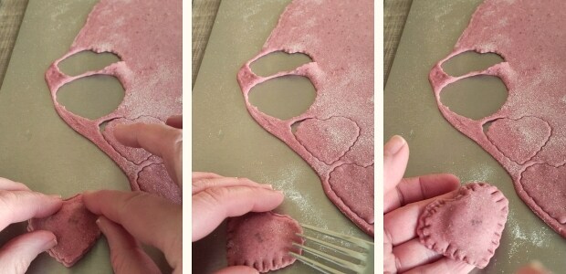 – Mit einem weiteren Herz Teig schließen und die Ränder mit einer Gabel versiegeln.