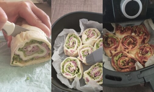 – Die Rolle schneiden und die Scheiben in den mit Backpapier ausgelegten Frittierkorb legen. Die Oberfläche leicht mit einem Pinsel bestreichen und etwa 15 Minuten backen.