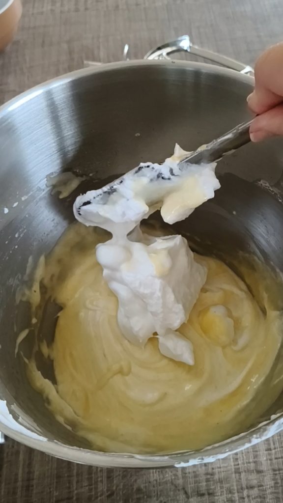• Die zuvor gesiebten trockenen Zutaten und die Vanille hinzufügen; gut mischen, um sicherzustellen, dass alle trockenen Zutaten gut integriert sind. Nun das steif geschlagene Eiweiß nach und nach mit sanften Bewegungen von unten nach oben unterheben, um die Masse nicht zu entlüften.