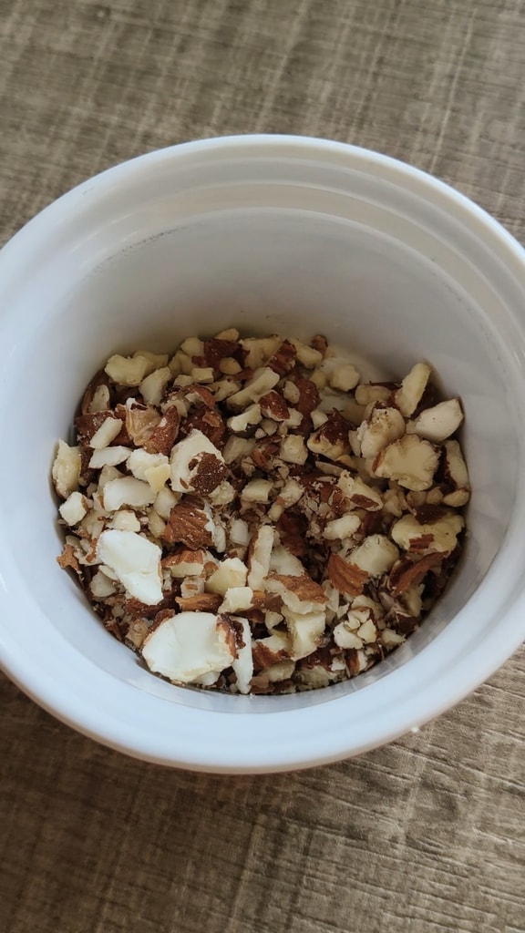 Fügen Sie die gehackten Mandeln hinzu: 10 Sek. – Rückwärtslauf – Stufe 3. In Eiswürfelbehälter gießen und einfrieren.