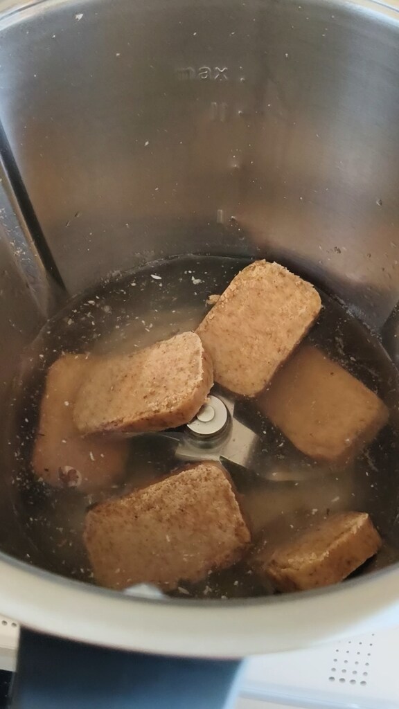 Beim Servieren die Würfel mixen: 30 Sek. Stufe 6 + 20 Sek. Stufe 4 und die Oberfläche mit ein paar groben Mandeln dekorieren.