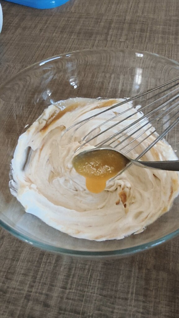 Den Honig hinzufügen und ins Joghurt einrühren, indem du mit dem Schneebesen rührst.