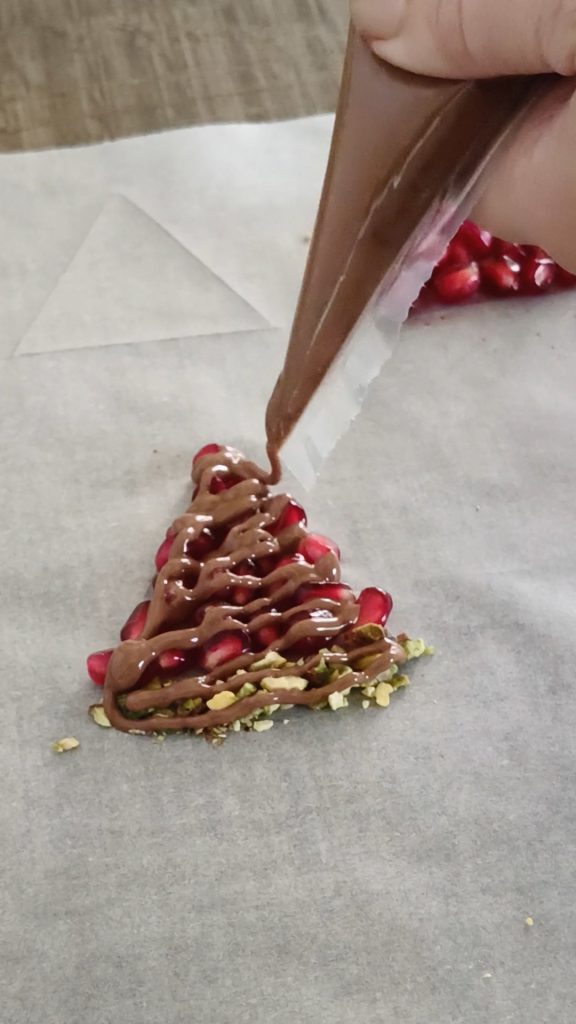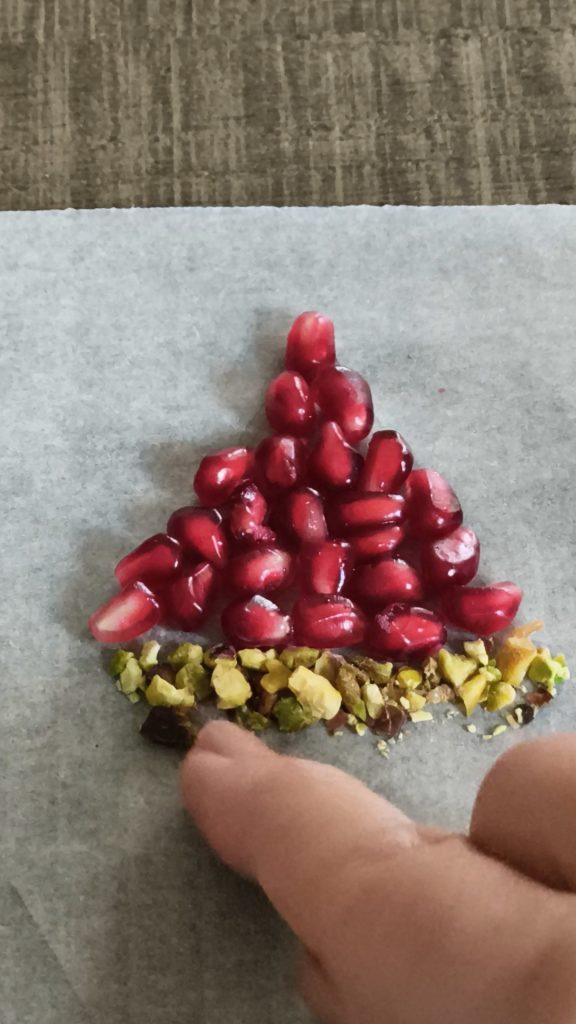 Fülle den Dreieck mit den Granatapfelkernen und definiere die Basis mit dem Pistaziengranulat. Nach Belieben kannst du auf die Spitze jedes Bäumchens Sternstreuseln hinzufügen.