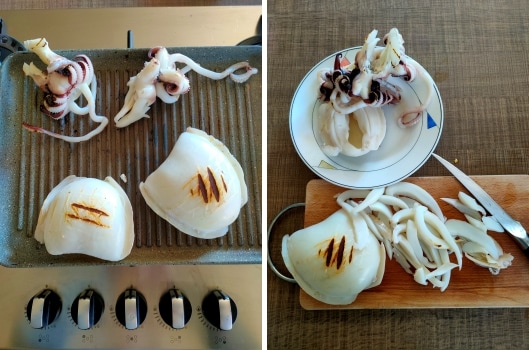 – Tintenfische reinigen und im Ofen mit Grillfunktion oder auf einem heißen Grill braten. Dann in Streifen schneiden und in einen Behälter geben.