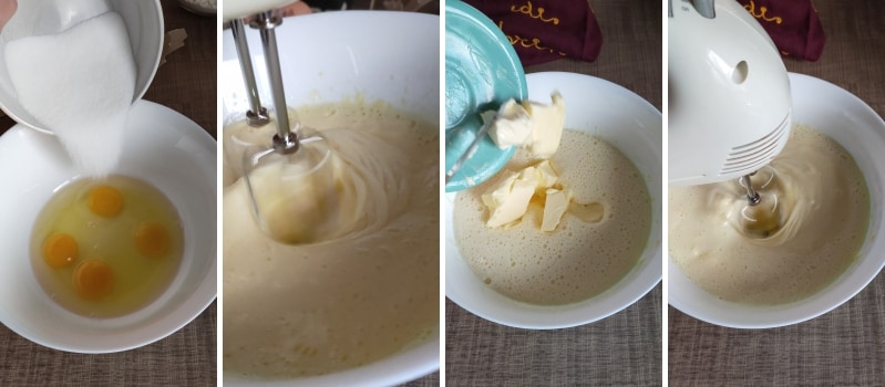 – Eier mit dem Zucker mit dem elektrischen Schneebesen aufschlagen, bis die Masse fast weiß ist, dann die weiche Butter hinzufügen. Gut mit dem Schneebesen schlagen, bis die Butter vollständig aufgenommen ist.