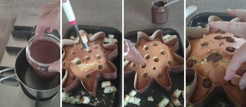– Bei lauwarmem Kuchen Löcher auf der Oberfläche mit einem Apfelausstecher (sehr praktisch) oder mit dem Griff eines Holzlöffels machen und den Aufstrich einfüllen. Die Löcher mit den Resten, die beim Ausstechen entstanden sind, abdecken.