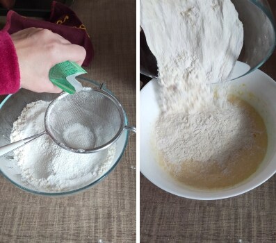 – Mehl, Kartoffelstärke und Backpulver zusammen mischen, alles gut durchsieben, um Klumpen und Unreinheiten zu vermeiden, und dann zur Eimasse hinzufügen.