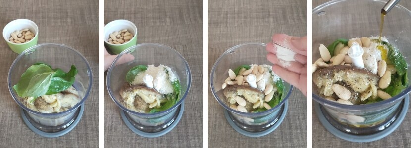 Um die Aubergine zu garen, habe ich statt des Ofens die Heißluftfritteuse benutzt und in weniger als 10 Minuten war sie bereit, zusammen mit Basilikum, Mandeln und Öl püriert zu werden.