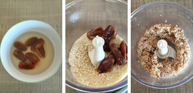 – Die Datteln etwa eine Stunde in lauwarmem Wasser einweichen, dann zusammen mit den Mandeln pürieren, bis eine klebrige Konsistenz erreicht ist.