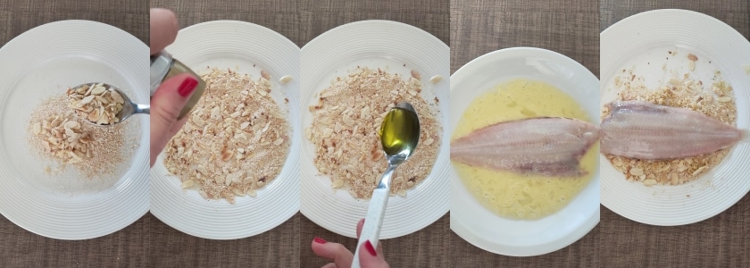– Semmelbrösel, Mandelblättchen und Öl in einen Teller geben; pfeffern und die Zutaten miteinander vermischen.