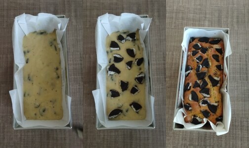 – Die Kastenform (25×8 cm) mit Backpapier auslegen und den Teig hineingießen; die 4 beiseitegelegten Kekse zerbröckeln und auf die Oberfläche geben, dann für etwa 40 Minuten backen, nach 35 Minuten die Stäbchenprobe machen.