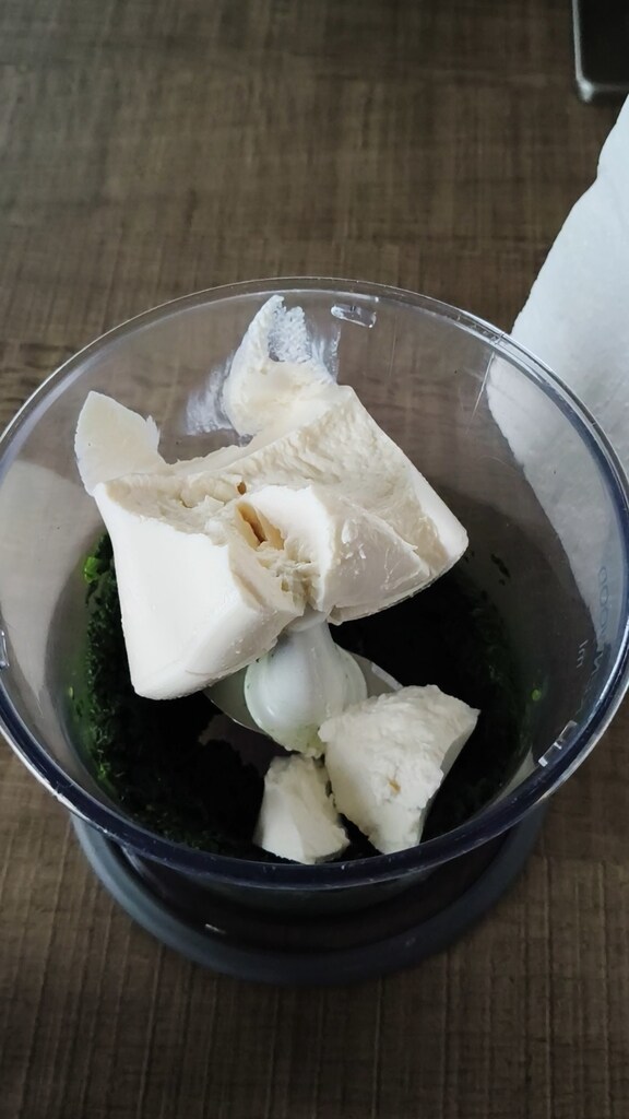 Die Ricotta im Becher des Zerkleinerers geben und ein paar Sekunden mixen, um sie mit dem Spinat zu vermengen.