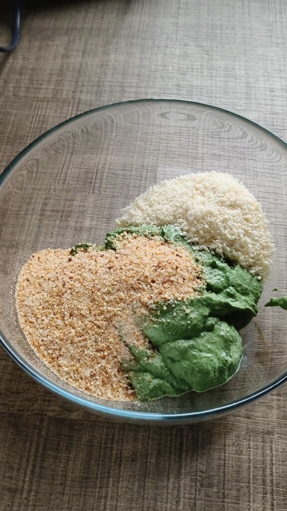 Die Spinat-Ricotta-Mischung in eine Schüssel geben und Semmelbrösel und Parmesan hinzufügen.