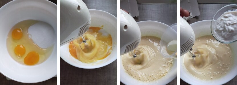 – Mit einem elektrischen Mixer die ganzen Eier mit dem Zucker schaumig schlagen, bis die Masse fast weiß wird; Öl und Joghurt (oder Sahne) langsam einfließen lassen.