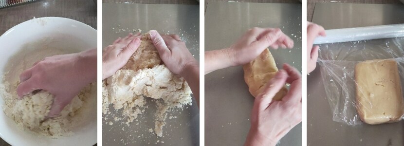 – Zuerst in der Schüssel und dann den Mürbeteig auf dem Nudelbrett fertig kneten, der in wenigen Minuten fertig ist. Den Mürbeteig in Frischhaltefolie einwickeln und mindestens 2 Stunden in den Kühlschrank legen.