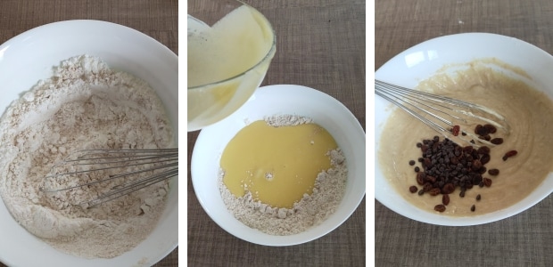 – In einer etwas größeren Schüssel die trockenen Zutaten, das Backpulver und die Vanille sieben; vermischen und dann die vorher vermischten flüssigen Zutaten in die andere Schüssel geben. Weiter mit dem Schneebesen oder der Gabel mischen und dann die Schokotropfen und die eingeweichten und ausgedrückten Rosinen hinzufügen.