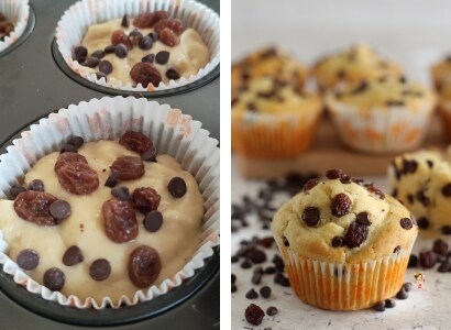 – Die Muffin-Förmchen zu 2/3 füllen und die Oberfläche nach Belieben mit Rosinen und Schokotropfen dekorieren. Für ca. 18 Minuten backen.