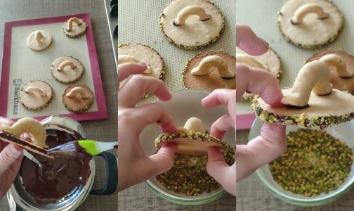 – Einen Pinsel in die Schokolade tauchen und den Rand der Kekse dekorieren, dann den schokoladenüberzogenen Rand in die gehackten Pistazien rollen.