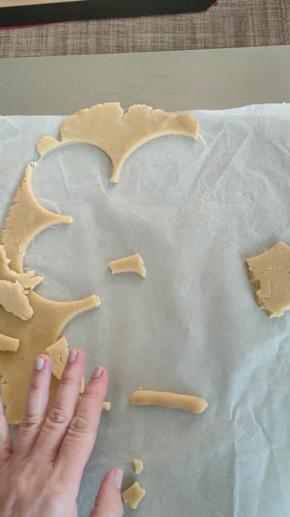 – Aus den Teigresten kleine Zylinder formen, die als Griff dienen; oder verwenden Sie kleine Ausstecher in Stern- oder Herzform. Diese auch für ein paar Minuten in den Kühlschrank stellen.