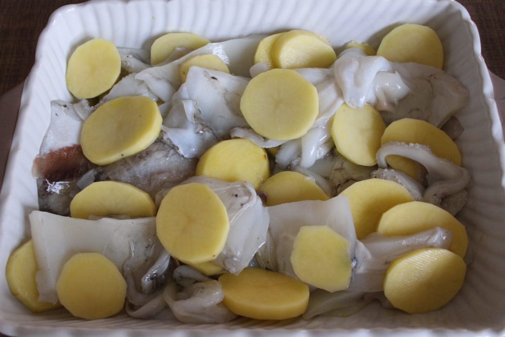 – Die Kartoffeln in Scheiben schneiden und abwechselnd mit den gereinigten und in regelmäßige Stücke geschnittenen Sepien in die leicht geölte Backform schichten.