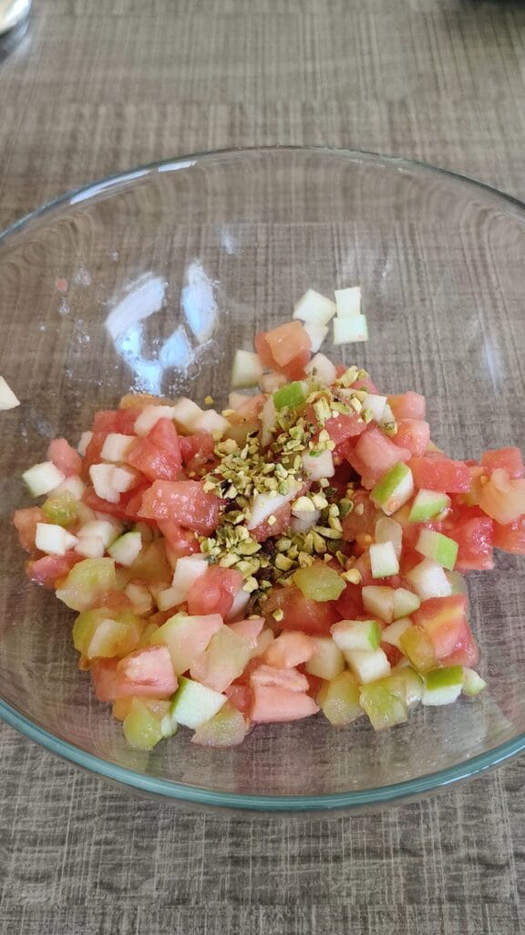 Die Tomatenwürfel zu den Äpfeln geben; die gehackten Pistazien hinzufügen.