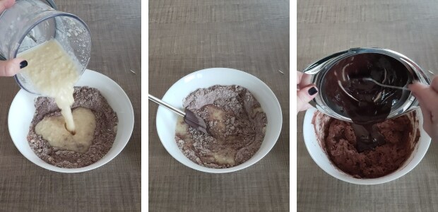 • – Nachdem ihr das Apfelmus mit den trockenen Zutaten vermischt habt, die geschmolzene und abgekühlte Schokolade hinzufügen.