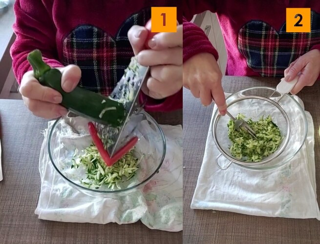 – Die gewaschene und geputzte Zucchini mit einer groben Reibe reiben (1); mit wenig Salz würzen und eine halbe Stunde ruhen lassen.