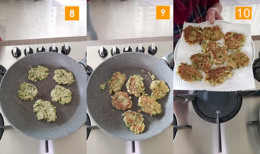 Die Pfanne mit etwas Öl erhitzen und die Mischung löffelweise hineingeben. Pro Seite etwa 2 Minuten braten. (8-9-10)
