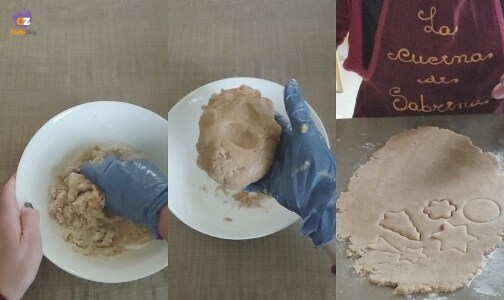 – Rollt den Mürbeteig auf eine Dicke von 5 mm aus und stecht Kekse mit Ausstechformen (Sterne, Bäumchen …) aus und legt sie nach und nach auf die Silikonmatte oder das mit Backpapier ausgelegte Blech.