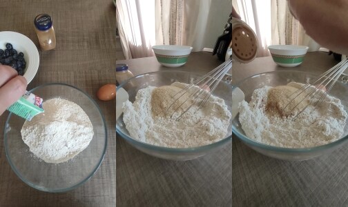 – Die trockenen Zutaten zu den flüssigen geben, die Zutaten zunächst mit dem Schneebesen verrühren, dann mit dem Spatel besser vermischen und die Blaubeeren hinzufügen, einige für die Dekoration der Oberfläche zurückbehalten.